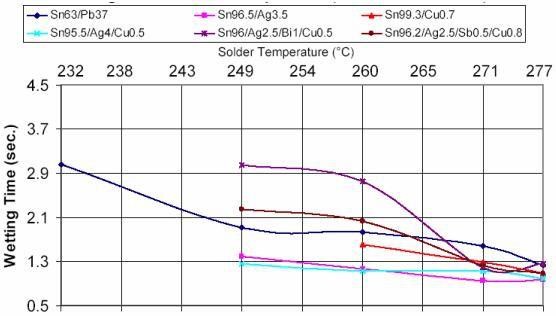 波峰焊的溫度并不等于錫爐溫度,在線測試表面,一般焊接溫度要比錫爐溫度低5℃左右,也就是250℃測量的潤濕性能參數(shù)大致對(duì)應(yīng)于255℃的錫爐溫度。通過實(shí)驗(yàn)表明,一般的無鉛釬料合金,最適當(dāng)?shù)腻a爐溫度為271℃。此時(shí)常用的無鉛合金一般存在最小的潤濕時(shí)間和最大的潤濕力,如圖5-27所示。當(dāng)采用不同的助焊劑時(shí),無鉛釬料潤濕性能最佳錫爐溫度有所不同,但是差別不大。