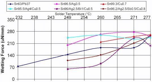 不同無鉛釬料在不同溫度下的潤濕力和潤濕時(shí)間