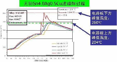 對(duì)于Sn-0.7Cu釬料合金+無鉛專用助焊劑/低VOC助焊劑組合而言,焊錫槽的最佳溫度為260-270℃;復(fù)合雙面板一般要比單面板溫度高10~25℃左右;無鉛波峰焊中最好使用Tg高的基板材料,因?yàn)槠溆懈玫淖杩鼓芰Αo鉛波峰焊對(duì)于元器件影響不是很大,圖5-28為SAC405釬料在焊接溫度下對(duì)不同測試點(diǎn)溫度的測試數(shù)據(jù),可以看出幾條曲線溫度相近。
