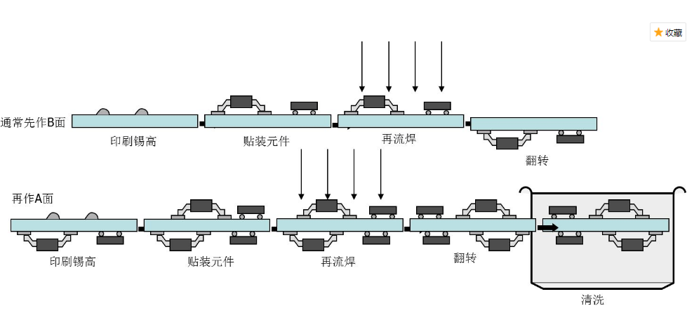 B,雙面貼裝:A面預涂錫膏→貼片(分為手藝貼裝和機器主動貼裝)→回流焊→B面預涂錫膏→貼片(分為手藝貼裝和機器主動貼裝)→回流焊→查看及電測驗。