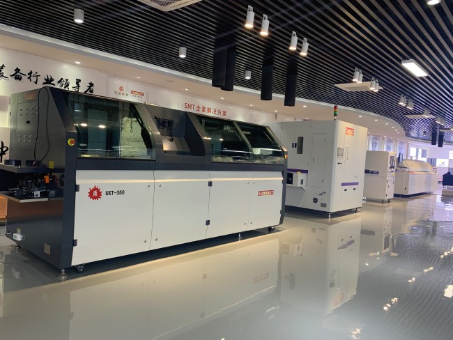 (8)清洗設(shè)備的作用是將貼裝好的PCB上影響電氣性能的物質(zhì)或?qū)θ梭w有害的焊接殘留物除去,如助焊劑等。若使用免清洗焊料,則可以不用清洗。清洗所用設(shè)備為超聲波清洗機(jī)和專用清洗液,其安裝位置不固定,可以在線,也可不在線。
